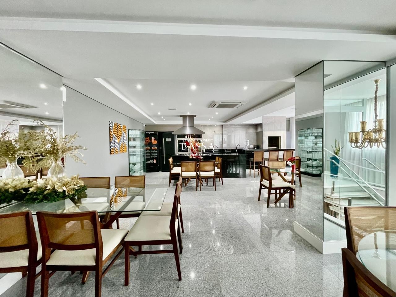- salão de festas mobiliado e equipado com: Churrasqueira Inox elevatória e giratória automática, fogão a gás, coifa industrial, 2 fornos, geladeira, cervejeira, louça em porcelana Schimidt personalizada, ar condicionado central, wifi e som ambiente;